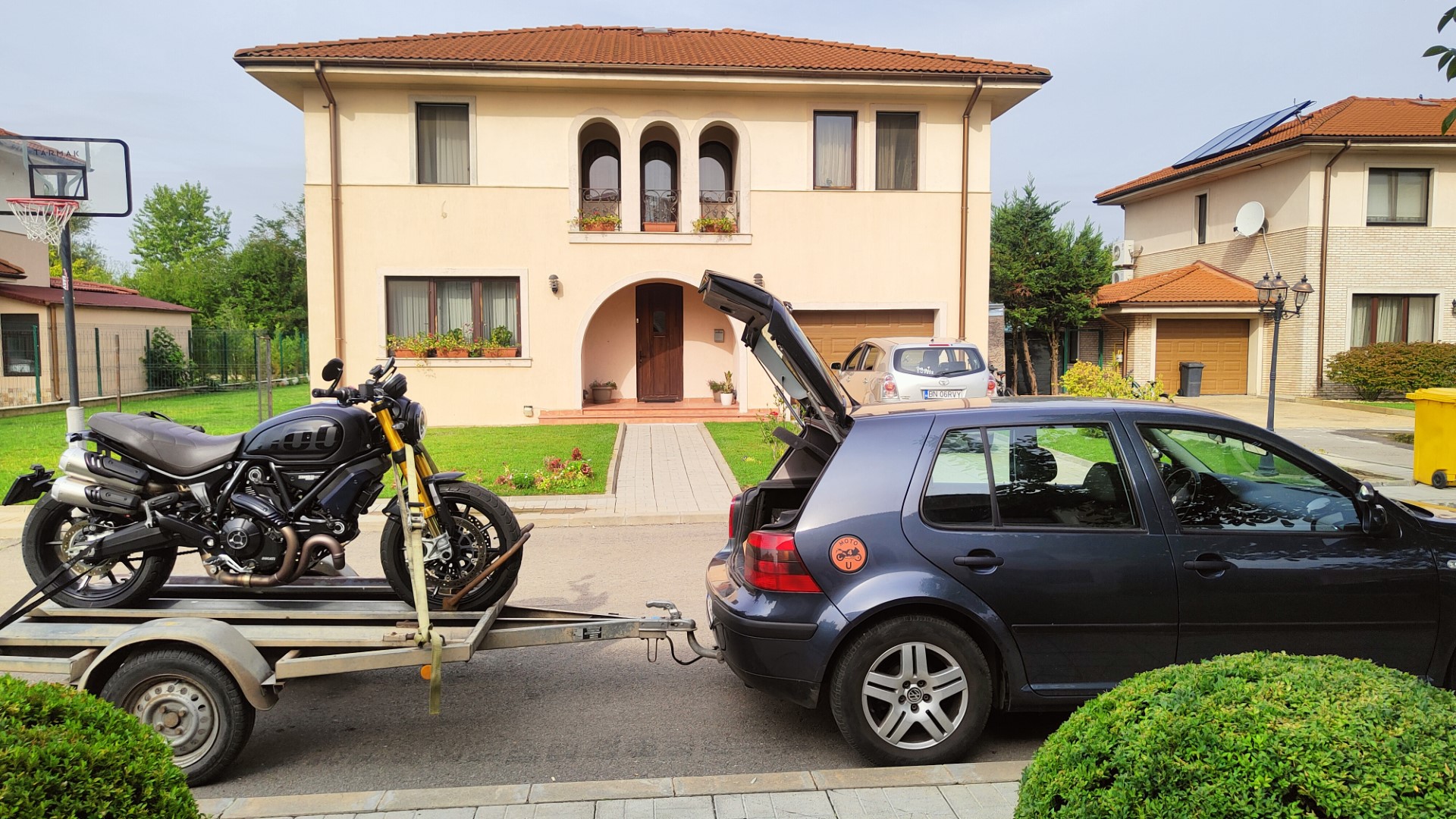 Folosim o remorca speciala, dedicata transportului de motociclete, dotata cu multiple prinderi ce asigura motocicleta in minim 4 puncte de ancorare.